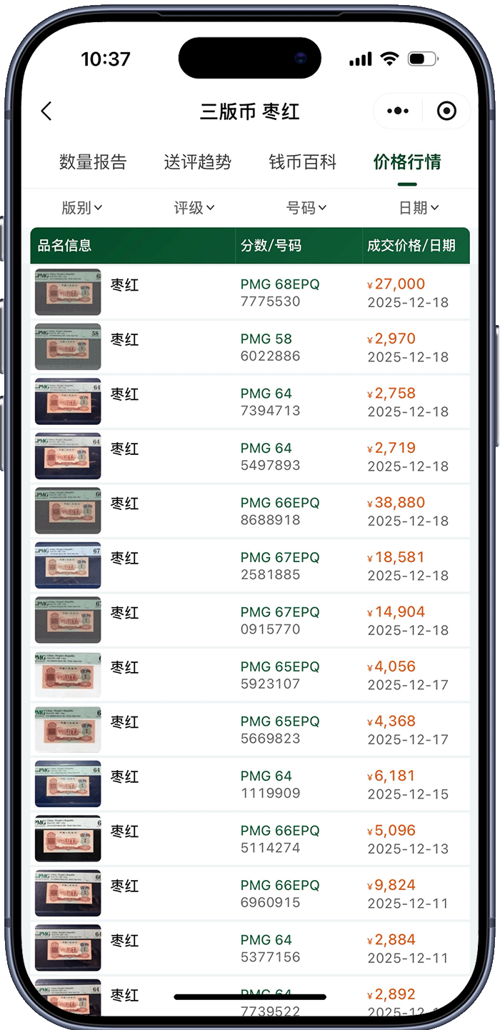 千藏网微信小程序支持一版币、二版币、三版币、四版币、大清宝钞、大明通行宝钞、户部官票等纸币价格查询,提供PMG评级查询、历史成交记录、数量报告、一版珍品排名查询等功能。